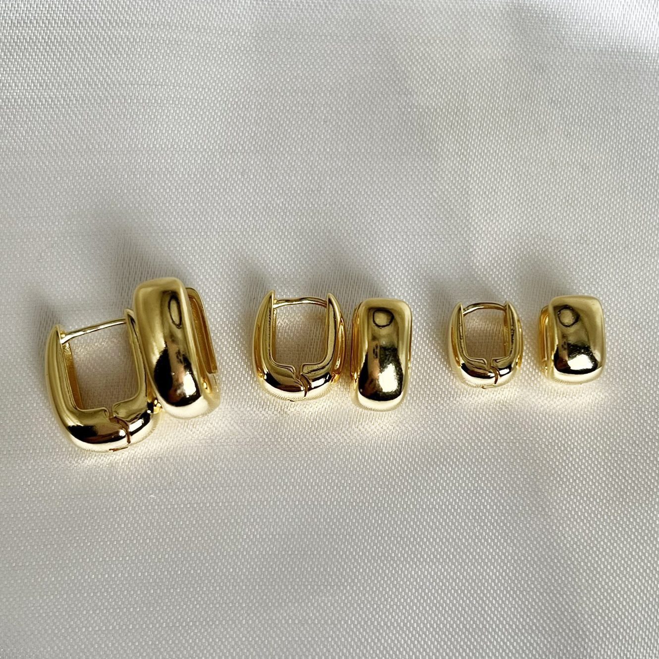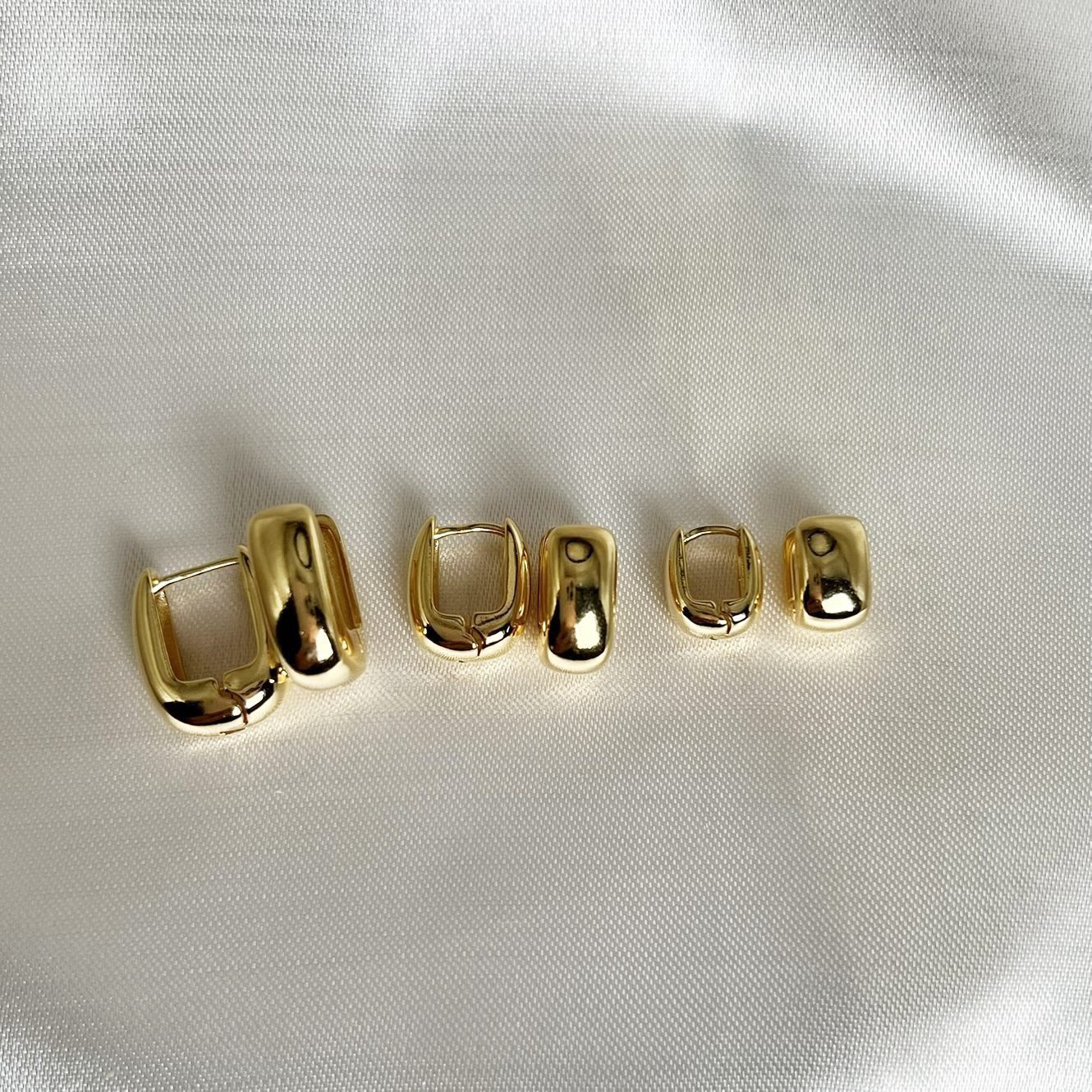 O trio de Argolas Quadradas Bombadas é a definição de elegância versátil. Com design robusto e moderno, cada tamanho foi pensado para compor um mix sofisticado de furos — do lóbulo principal às perfurações superiores. O formato levemente arredondado nas bordas suaviza o visual geométrico e garante um brilho intenso e uniforme.