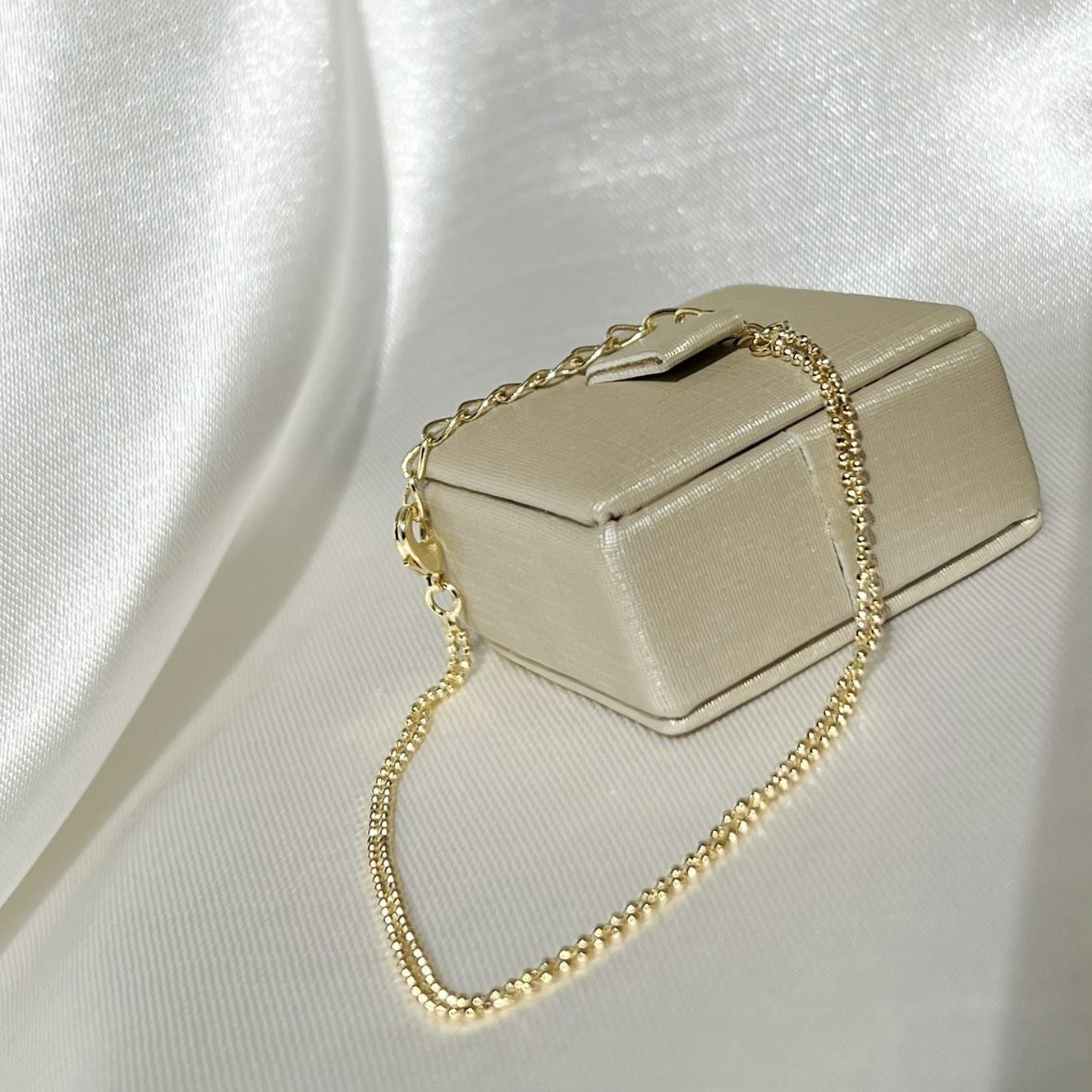 Minimalista e sofisticada, a Pulseira Dupla de Bolinhas combina a delicadeza do design com o charme atemporal do dourado. Suas duas correntes com esferas polidas criam um efeito elegante e fluido no pulso, trazendo movimento e brilho na medida certa. Ideal para compor produções leves, modernas e femininas.